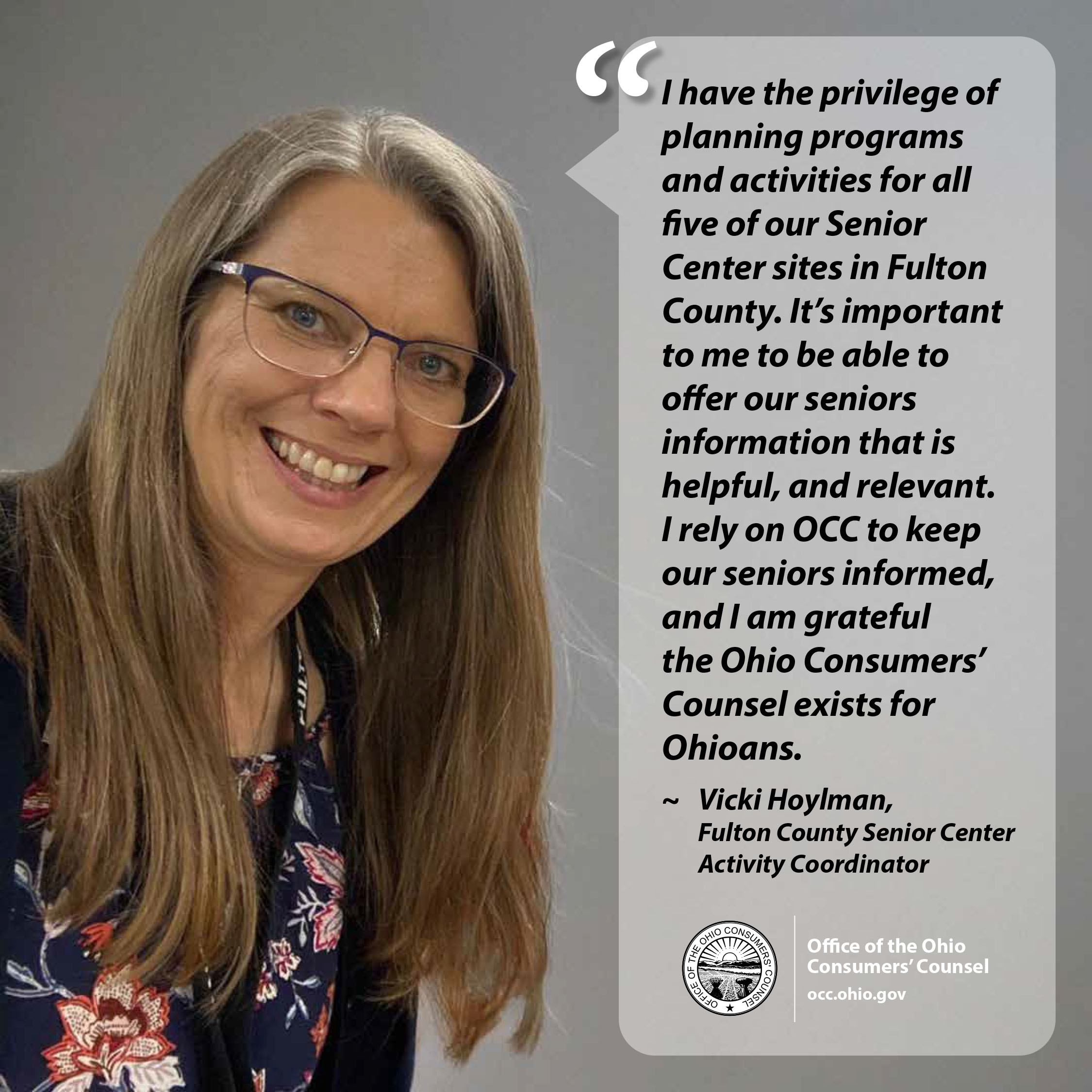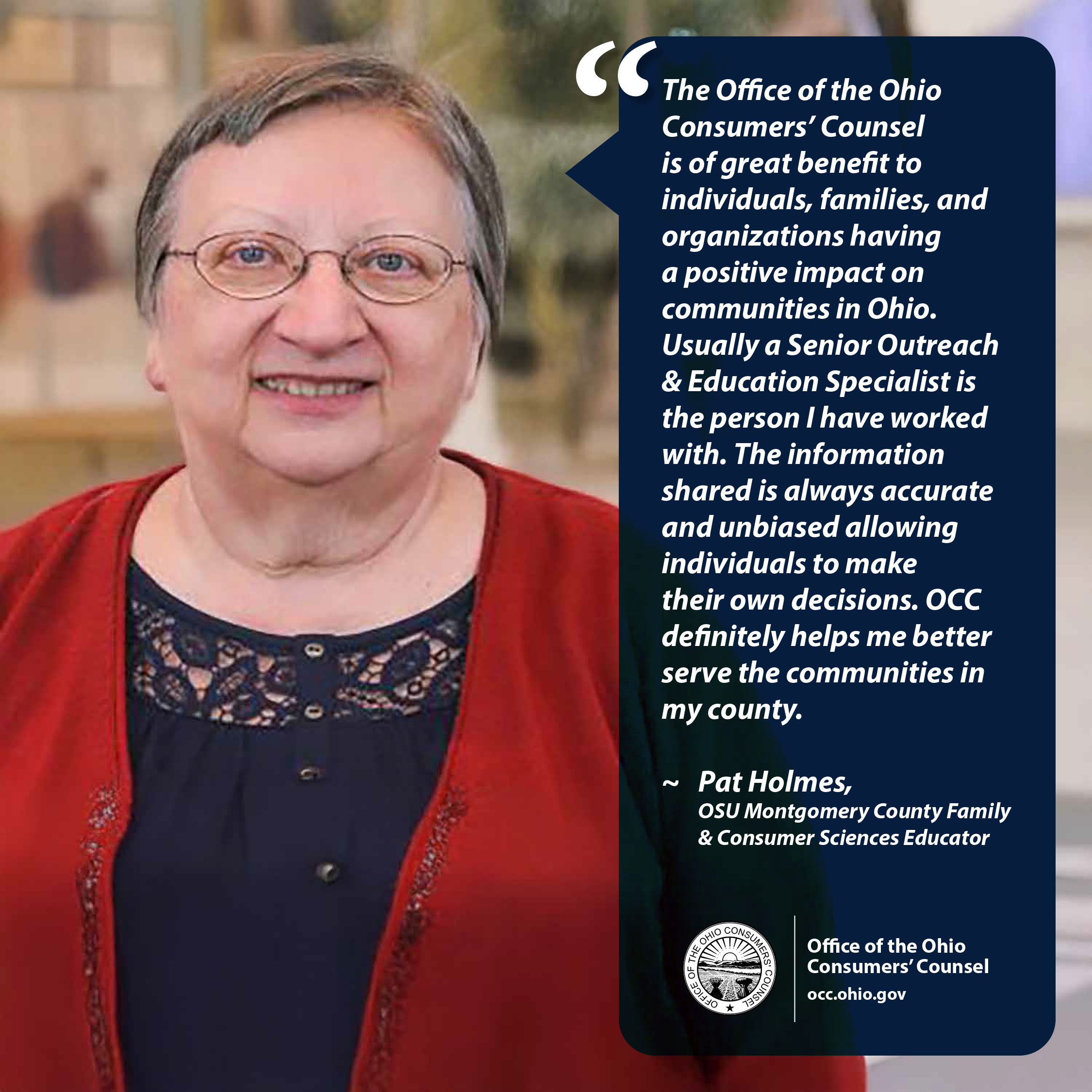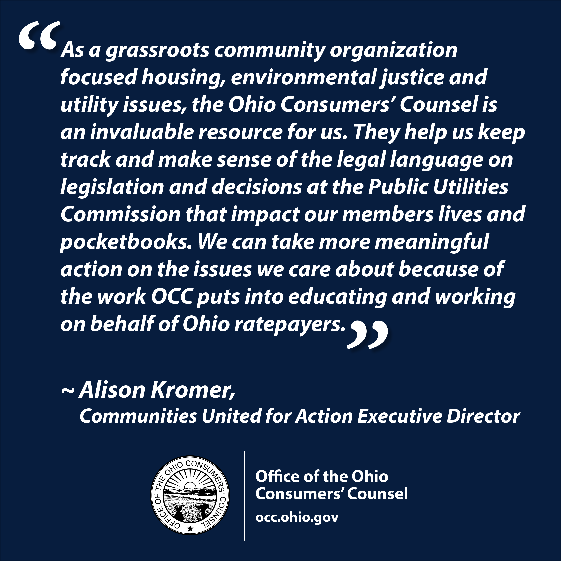 The Ohio Consumers’ Counsel advocates and educates to secure for Ohioans affordable, reliable and equitable residential utility services that are essential to their well-being.