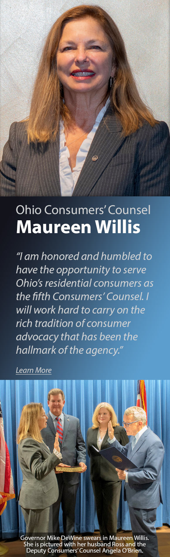 “I am honored and humbled to have the opportunity to serve Ohio’s residential consumers as the fifth Consumers’ Counsel. I will work hard to carry on the rich tradition of consumer advocacy that has been the hallmark of the agency,” said Consumers’ Counsel Maureen Willis.