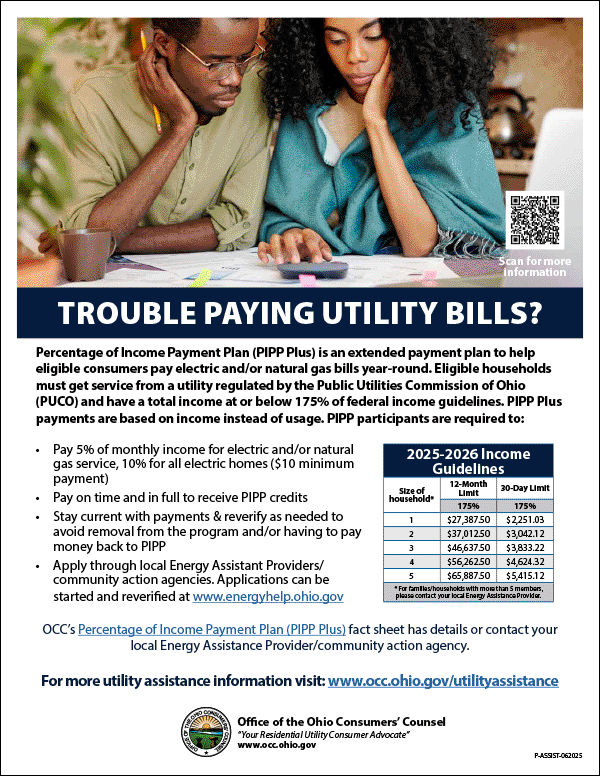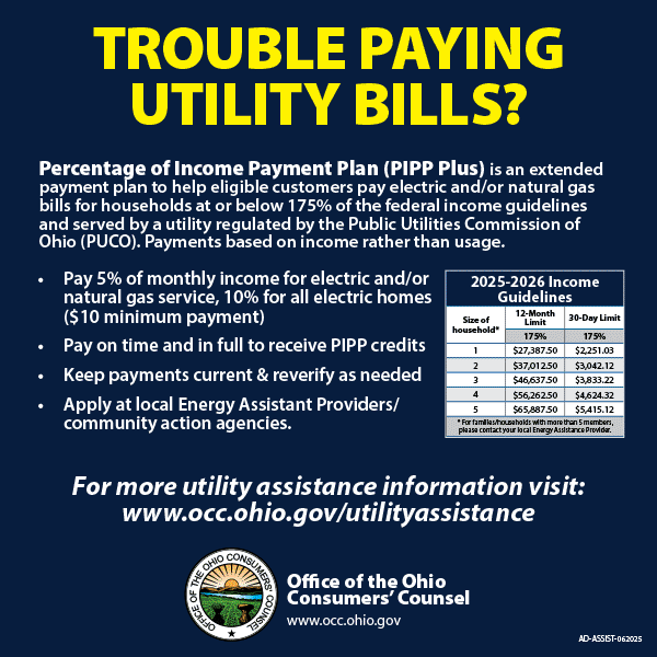 The Percentage of Income Payment Plan (PIPP Plus) is a payment arrangement to help eligible electric and natural gas customers pay their utility bills.